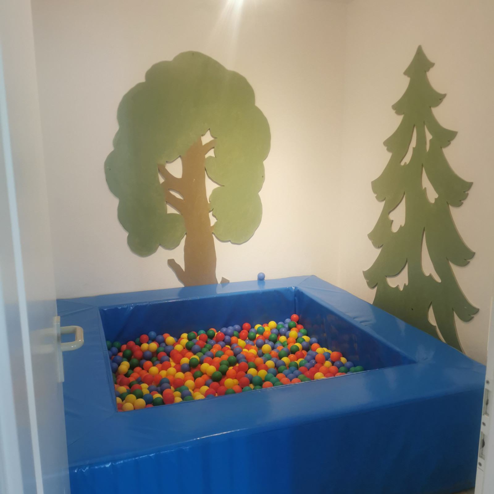 Ein besonderes Highlight ist unser großer Spielraum mit einem kleinen Rutschturm – perfekt zum Klettern, Rutschen und Austoben. Außerdem gibt es einen separaten Raum mit einem großen Bällebad, das bei den Kindern sehr beliebt ist und spielerisch die Motorik fördert.